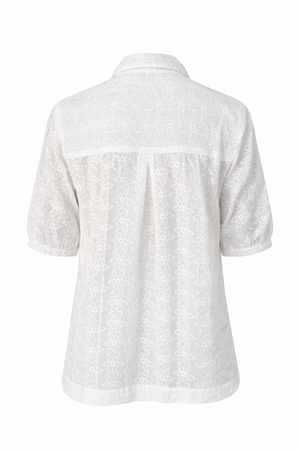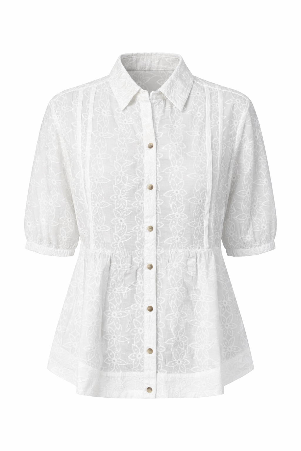 Details: Button-through front, delicate all-over embroidery, and soft gathering through the body