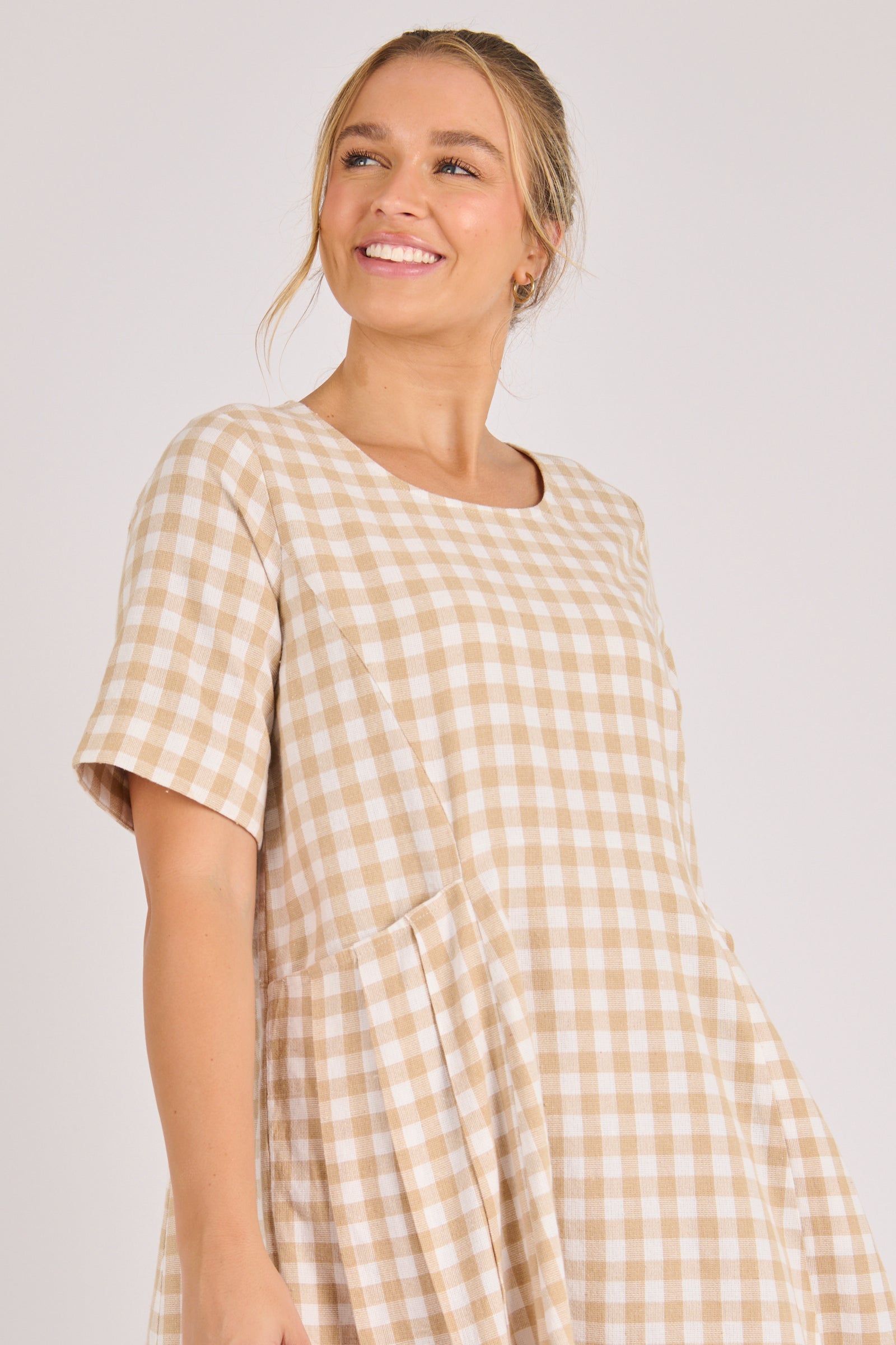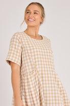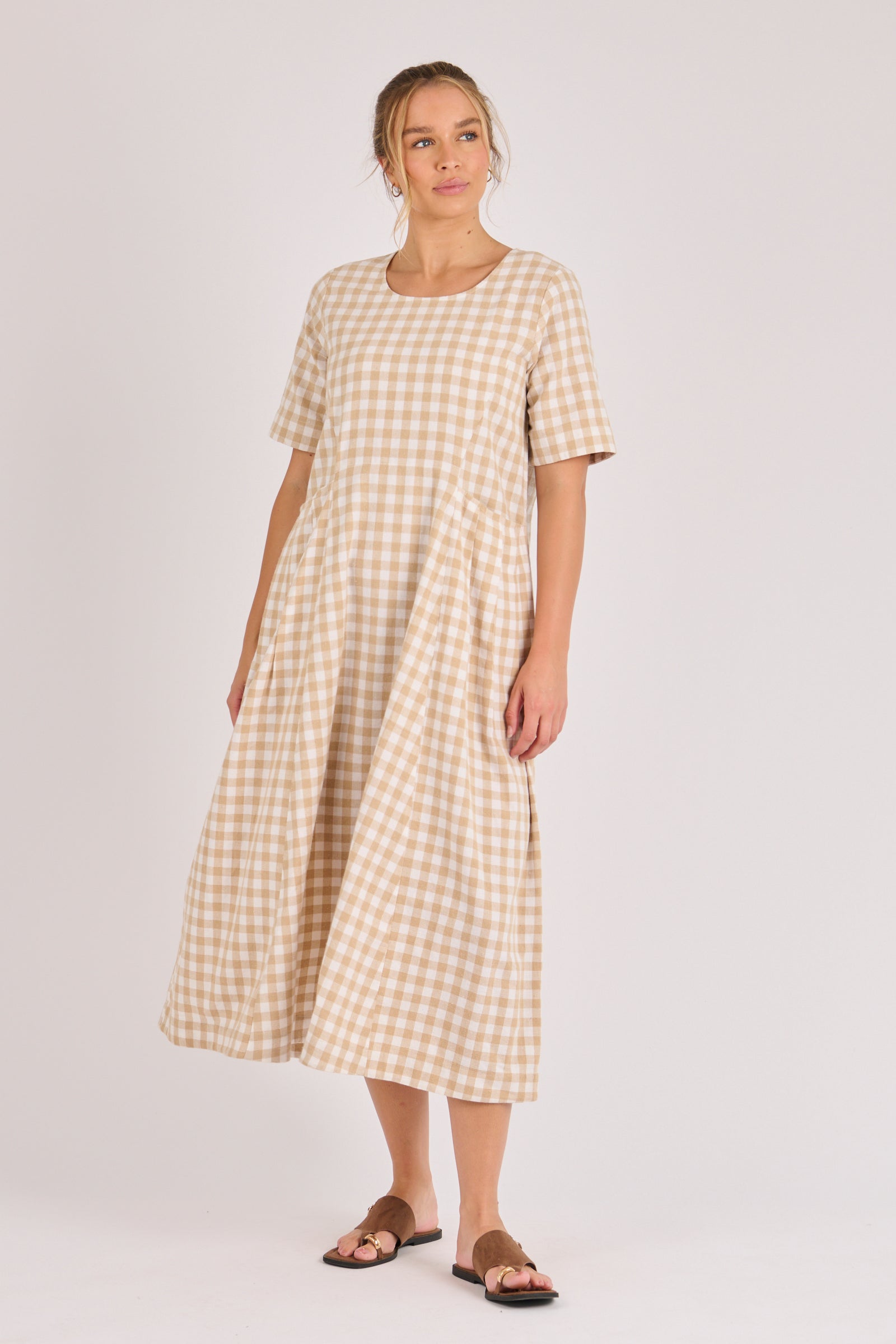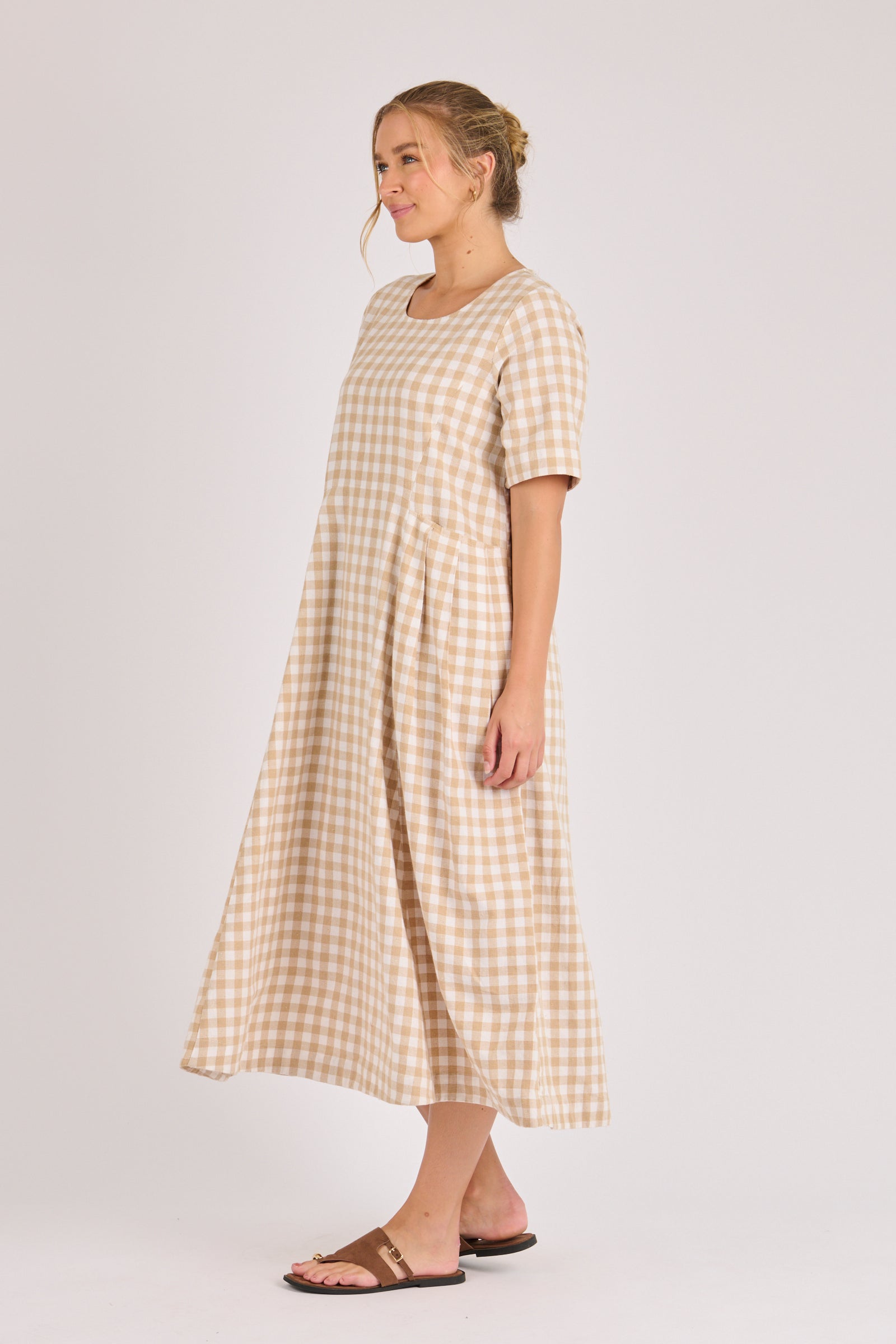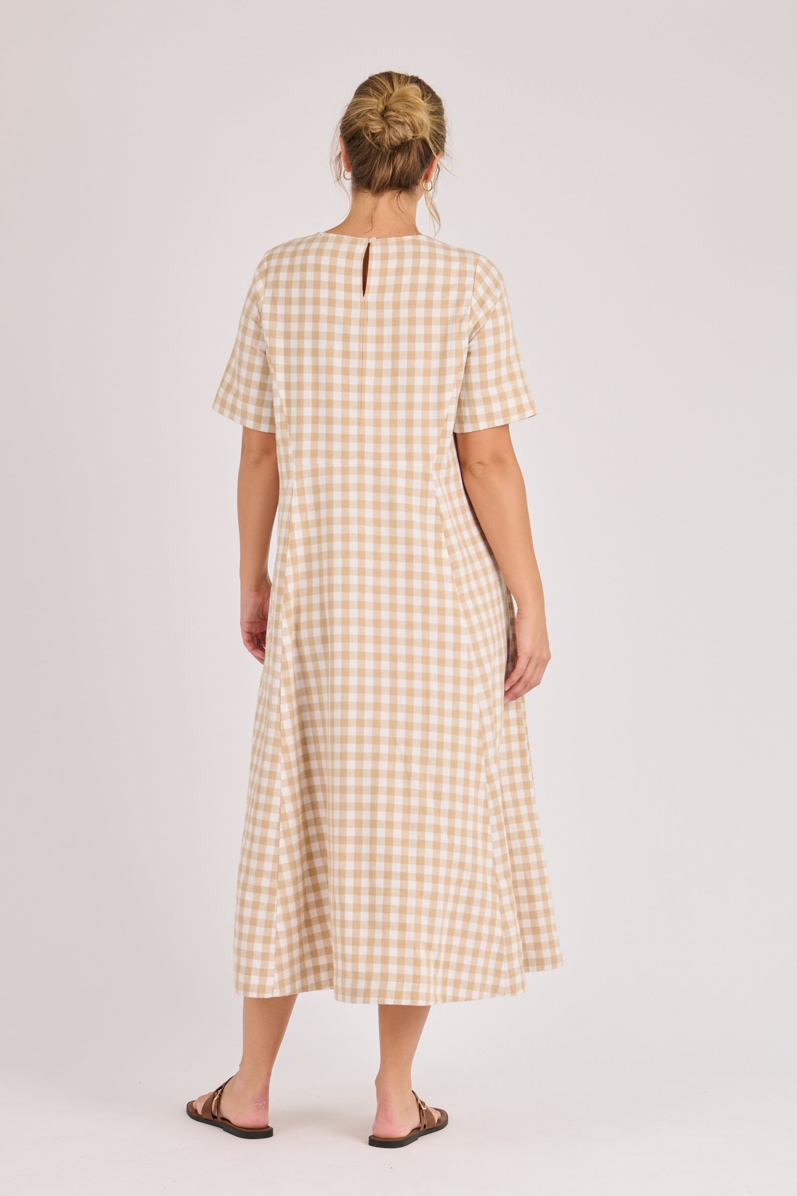 The Relaxed Pocket Midi Dress in Latte Check is an easy-wearing statement piece designed for comfort, movement and everyday versatility. Featuring a softly structured bodice with panelled detailing through the skirt, this dress creates a beautiful drape and gentle A-line shape. Finished with short sleeves, a classic round neckline and a subtle button closure at the back, it’s the kind of throw-on dress that feels polished without the effort.
