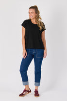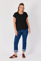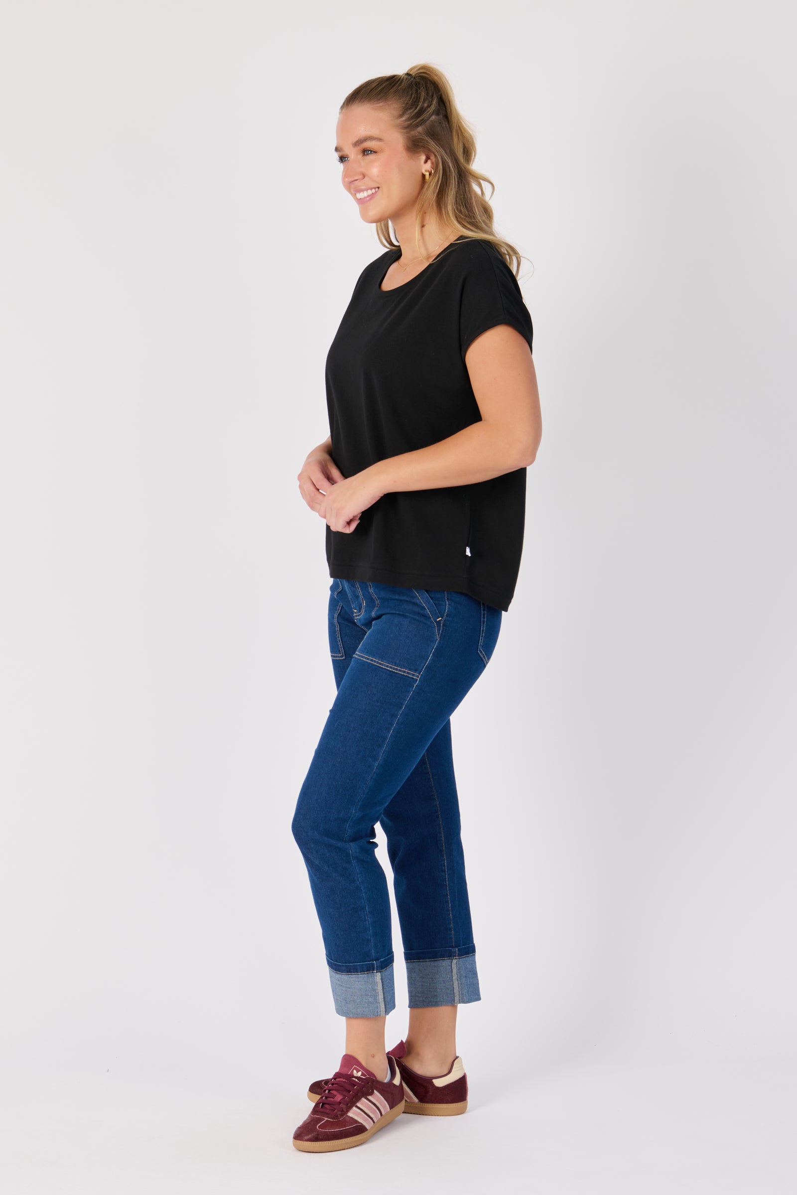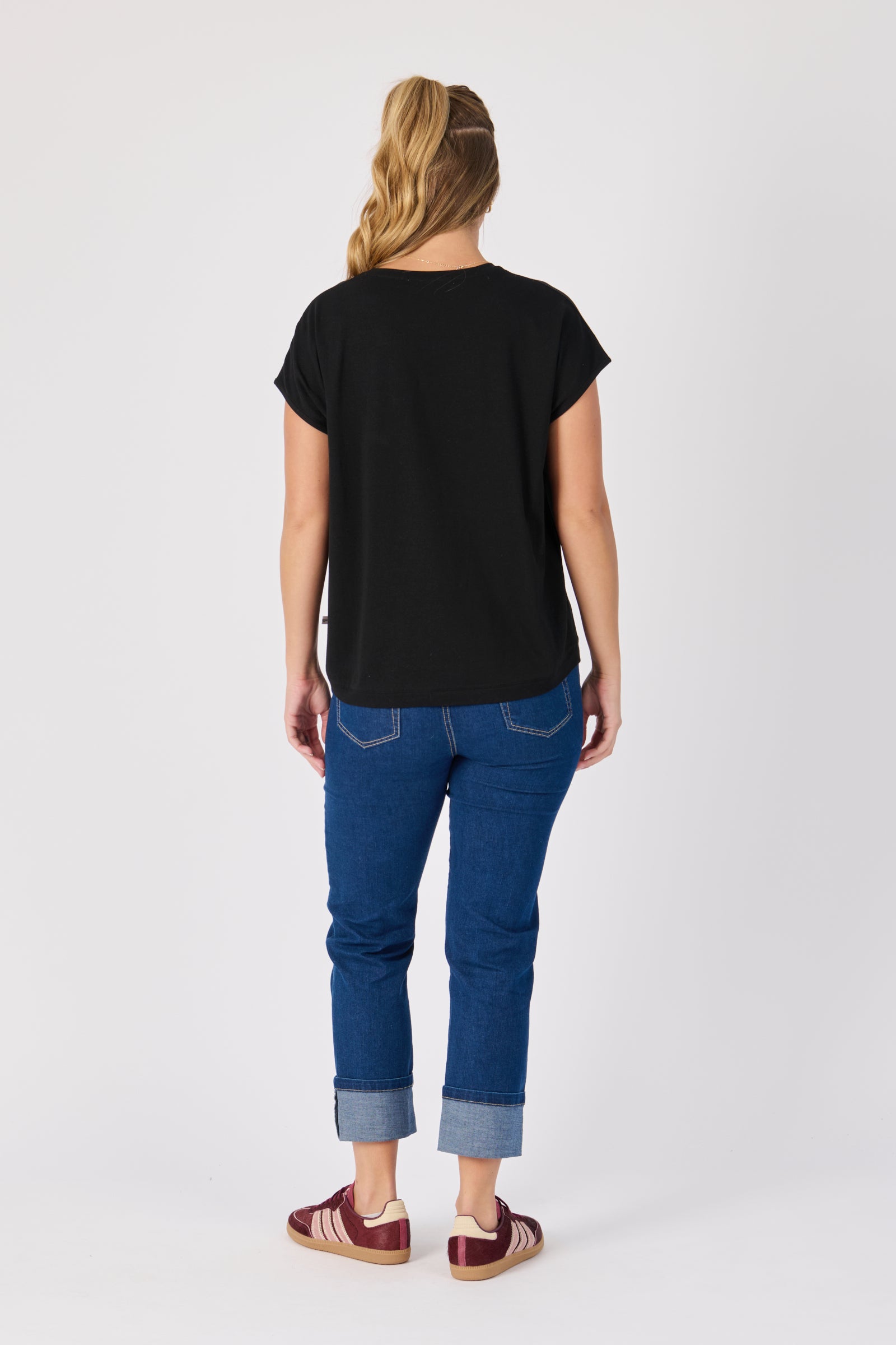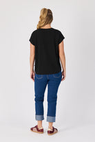 Its curved hemline is slightly longer at the back, creating a soft, feminine shape that looks great tucked in or left out. The tee is crafted from a blend of 95% cotton and 5% elastane, giving it a breathable, soft feel with a hint of stretch. This blend ensures that the tee holds its shape throughout the day while allowing ease of movement, making it ideal for all-day wear.