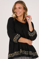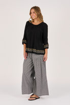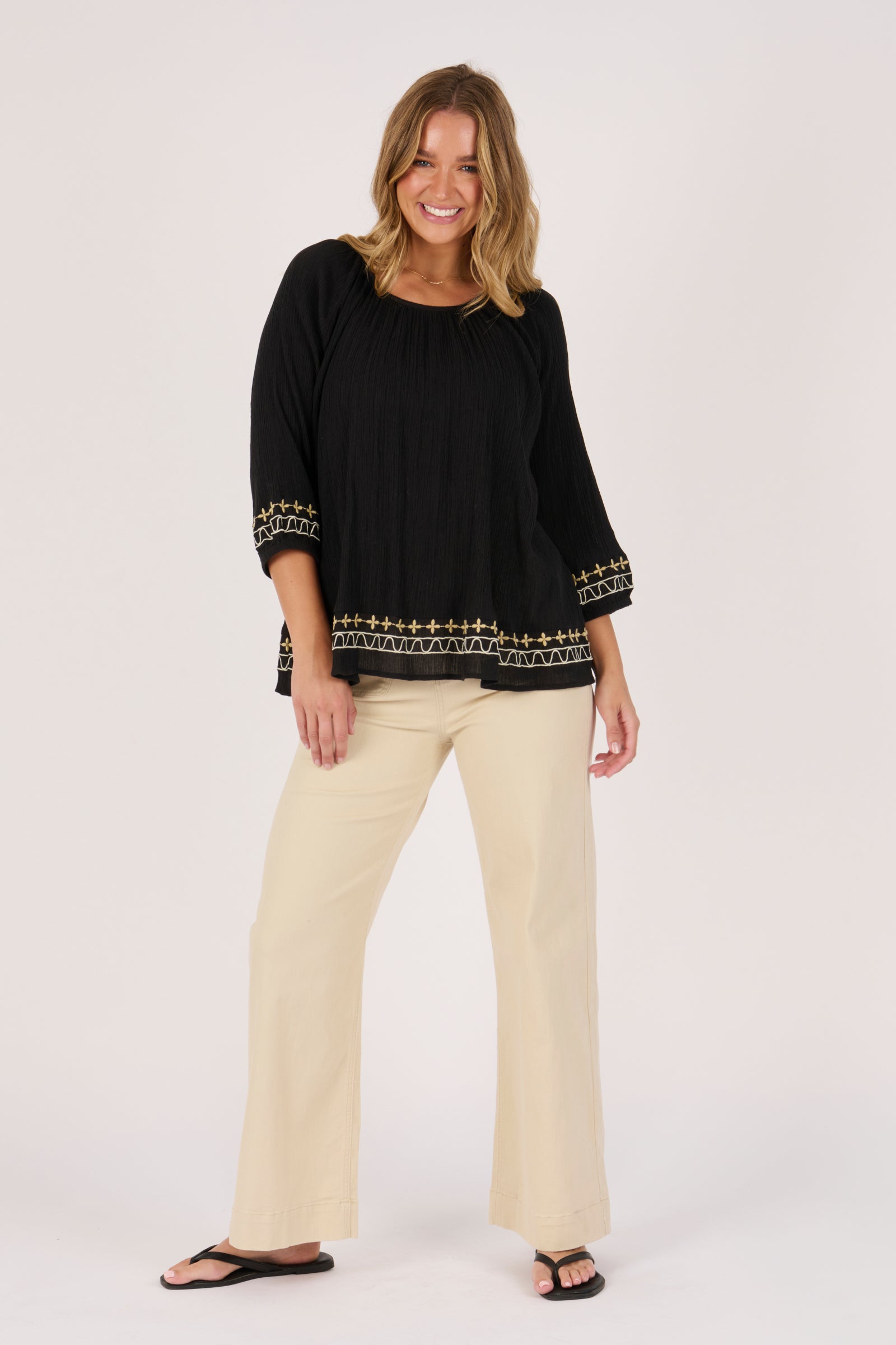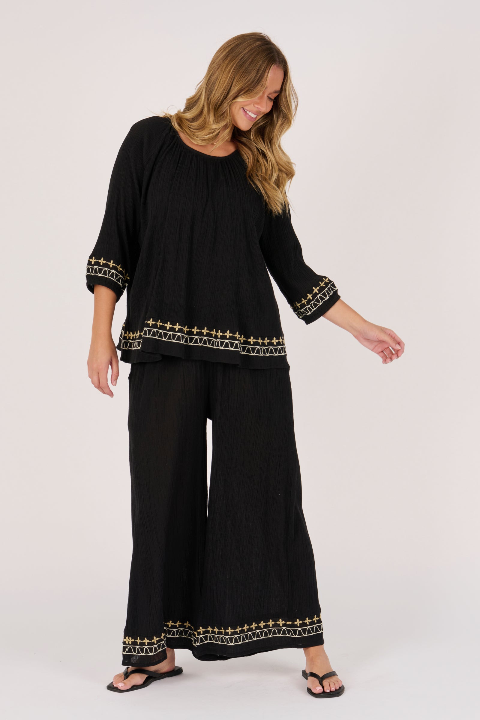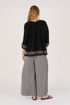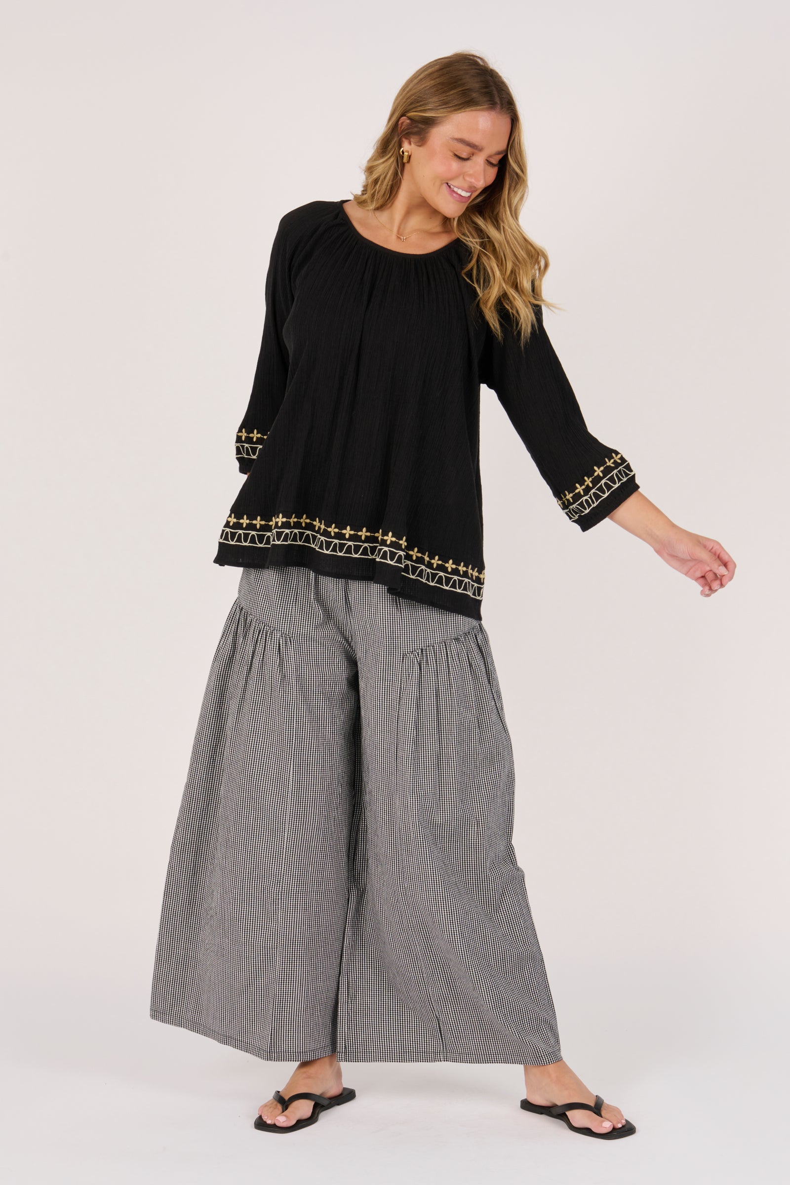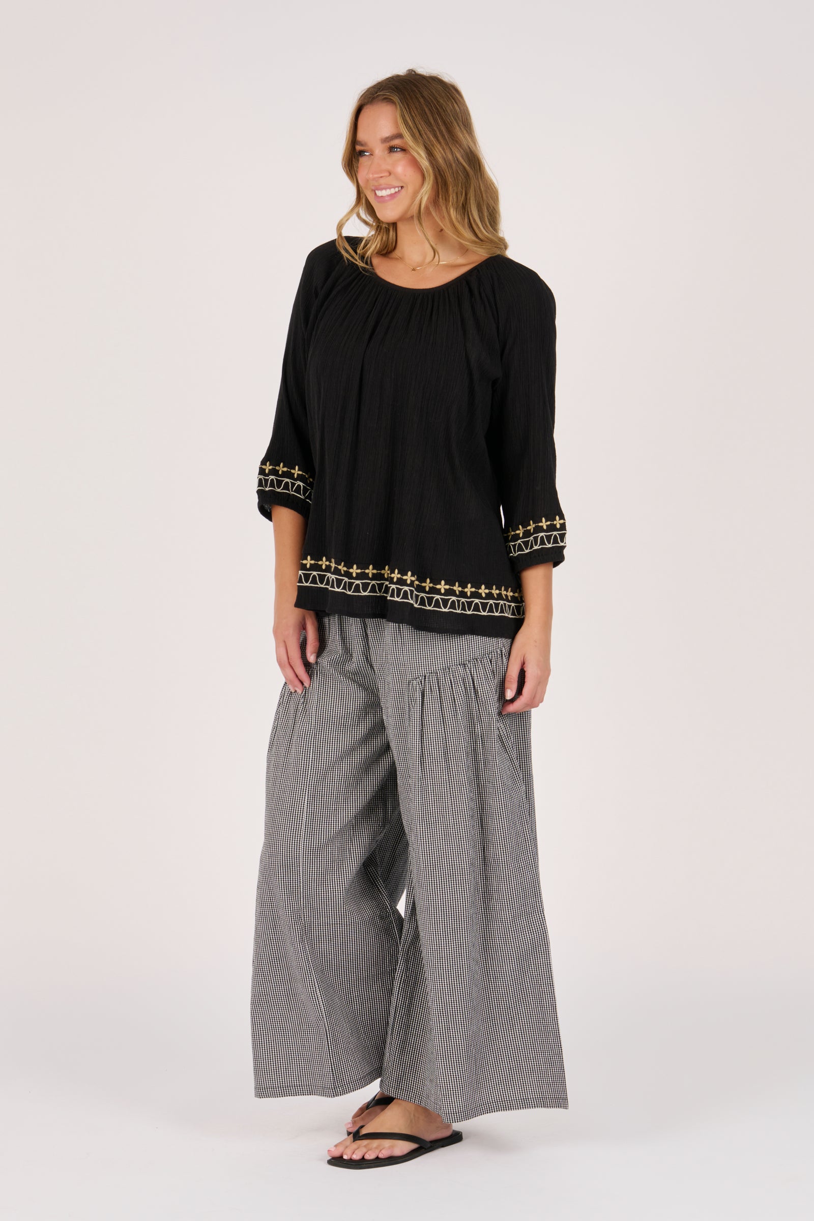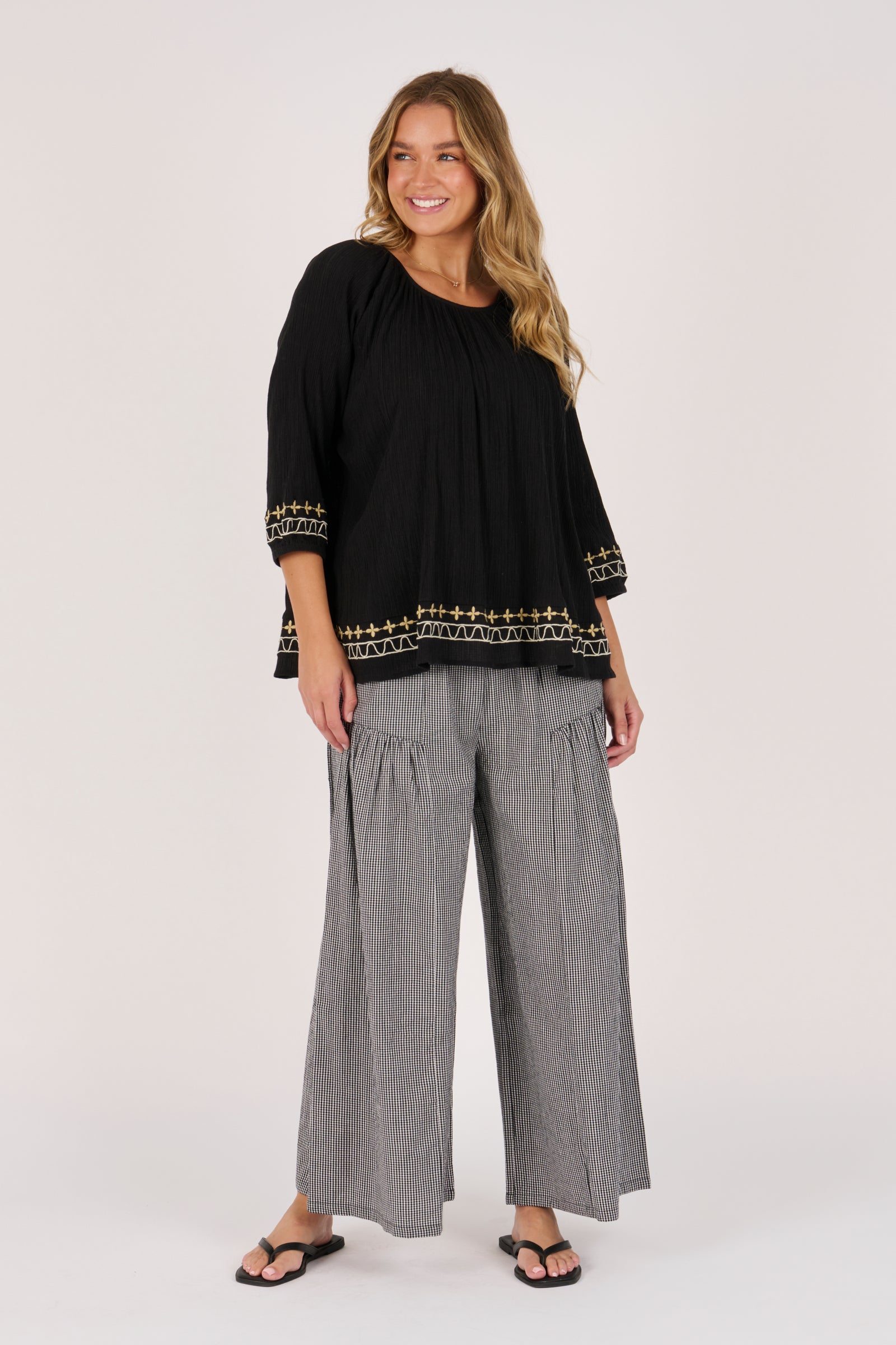 The Gathered Neck Blouse in Black is a lightweight cotton style with an easy, relaxed fit. Featuring subtle embroidery along the hem and sleeves, this blouse adds an artisanal finish to everyday dressing. Its flowy silhouette makes it a versatile piece, pairing effortlessly with jeans, skirts, or the matching Shirred Waist Wide Leg Pant.