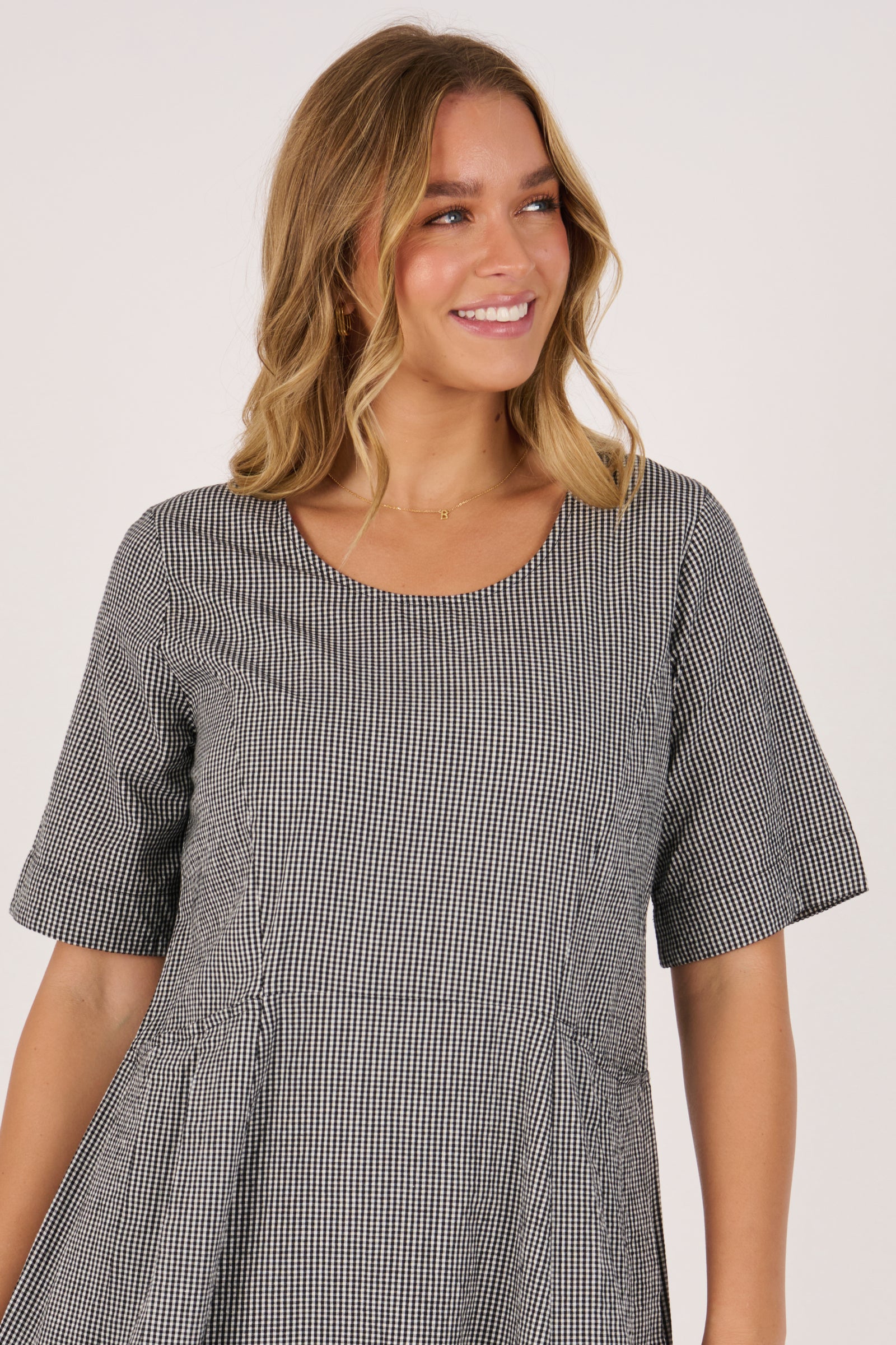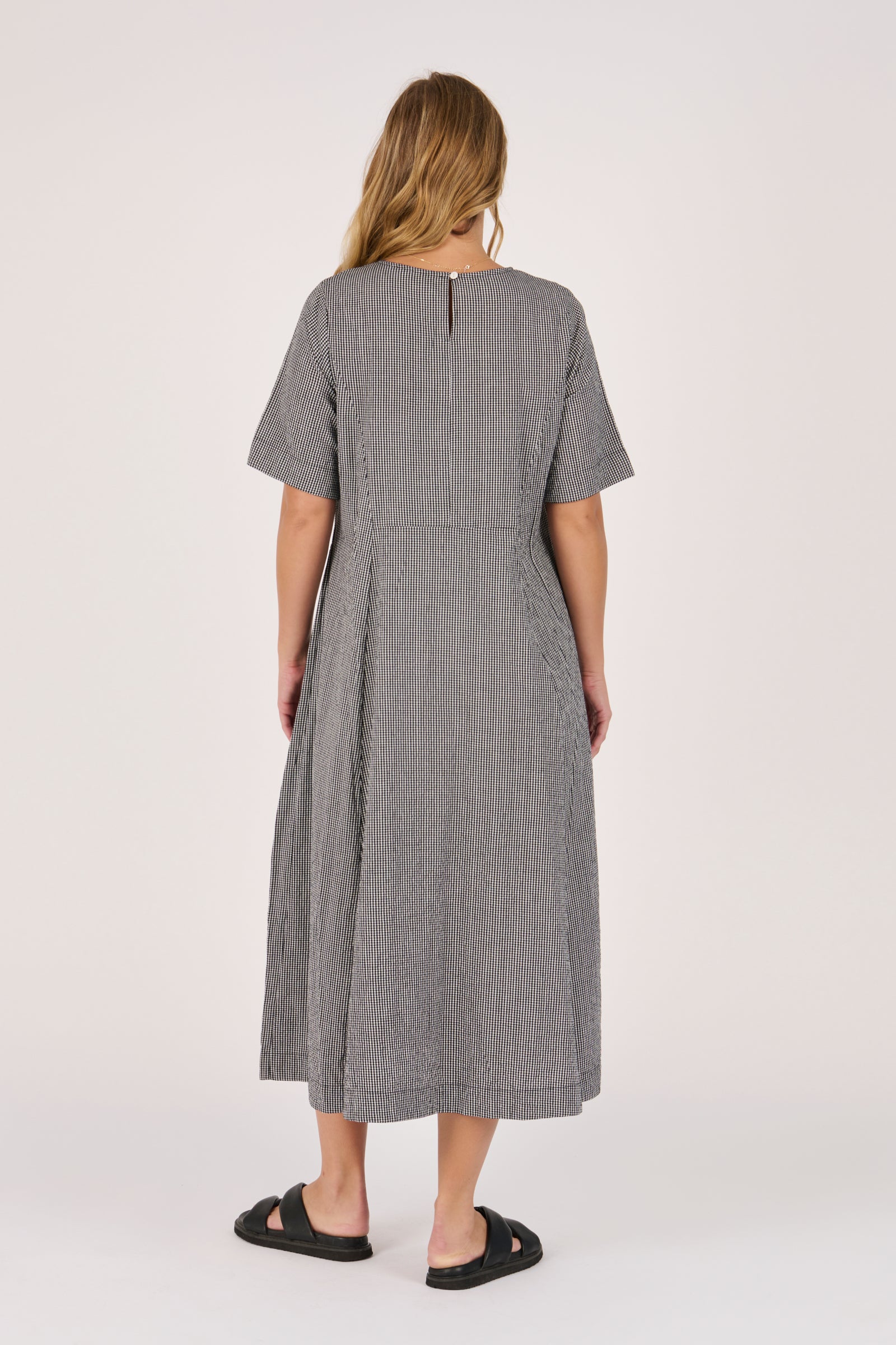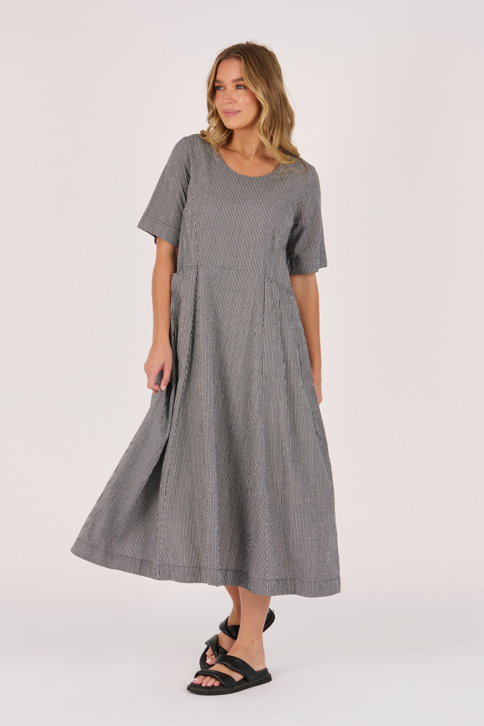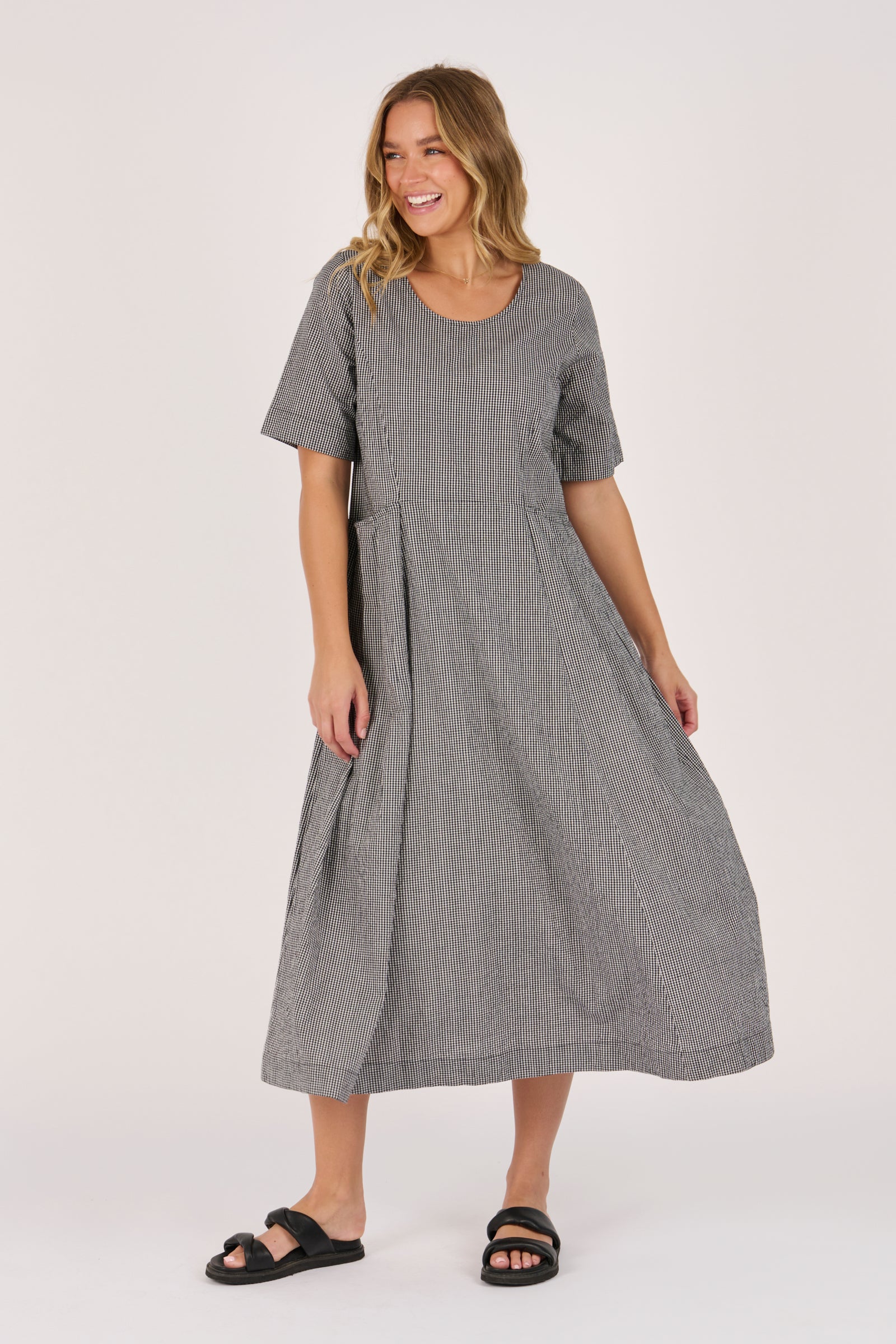 This black and white check midi dress features soft pleat detailing, short sleeves, and handy side pockets. Crafted from a breathable cotton-viscose blend, it’s the perfect throw-on style for everyday Spring/Summer wear.