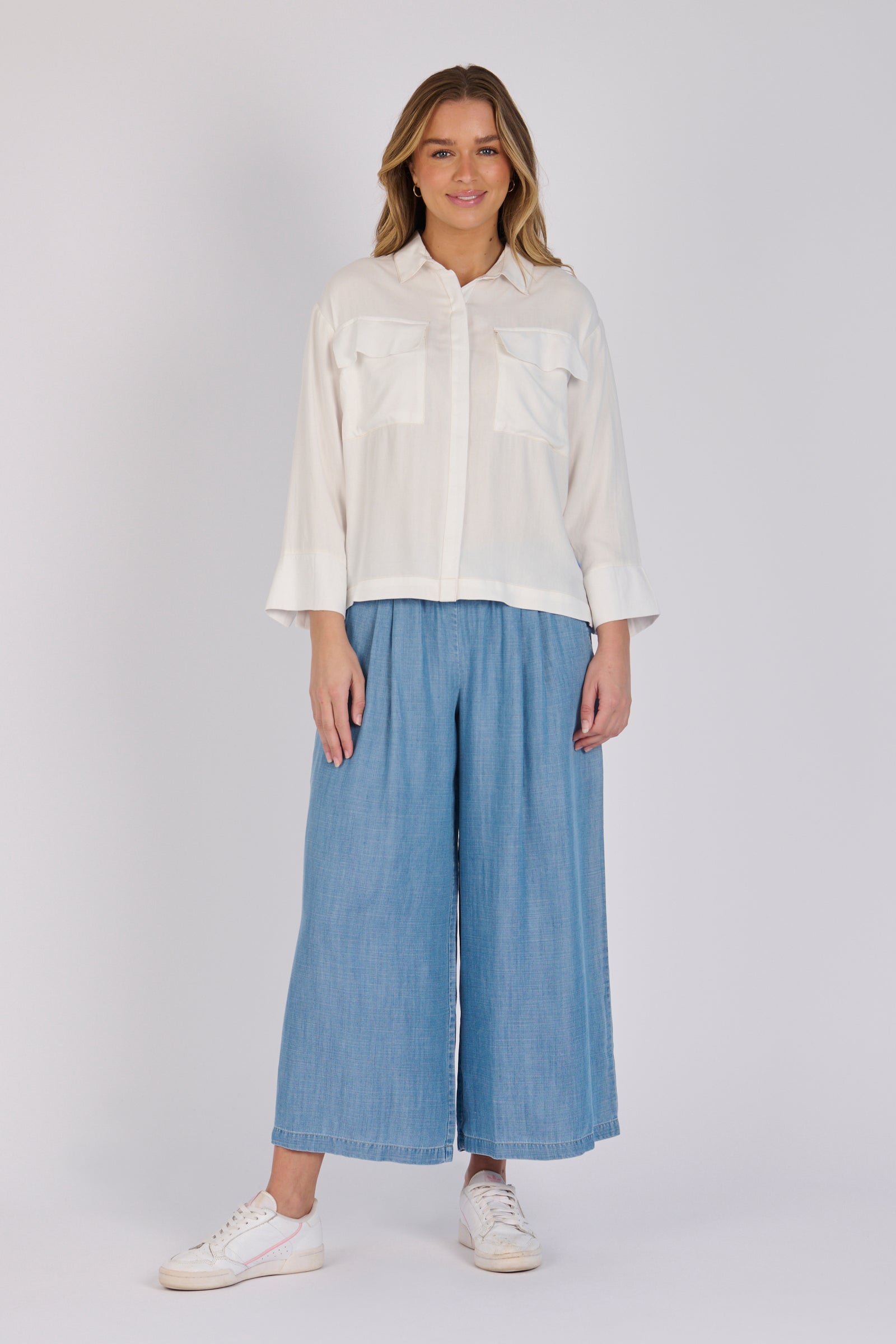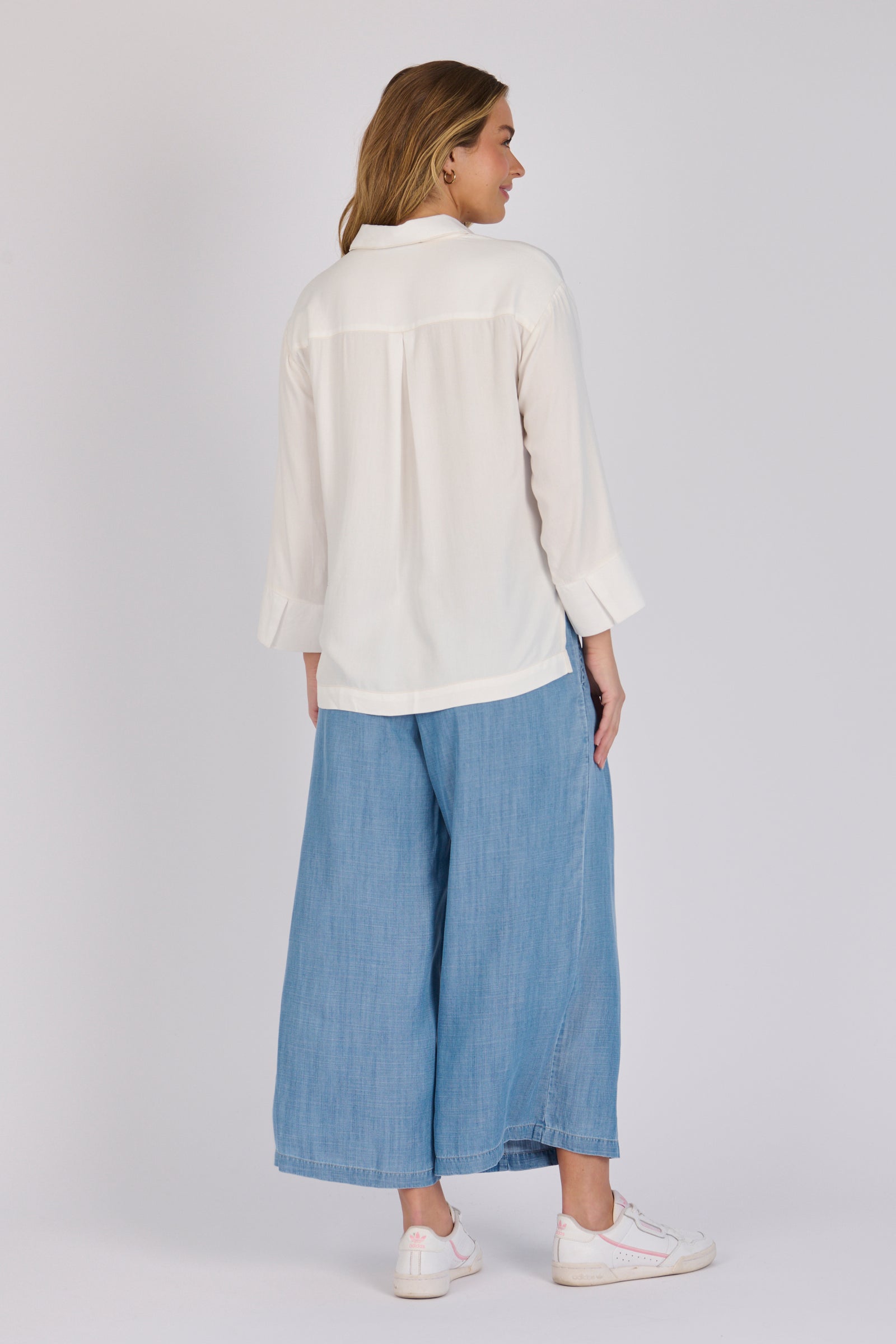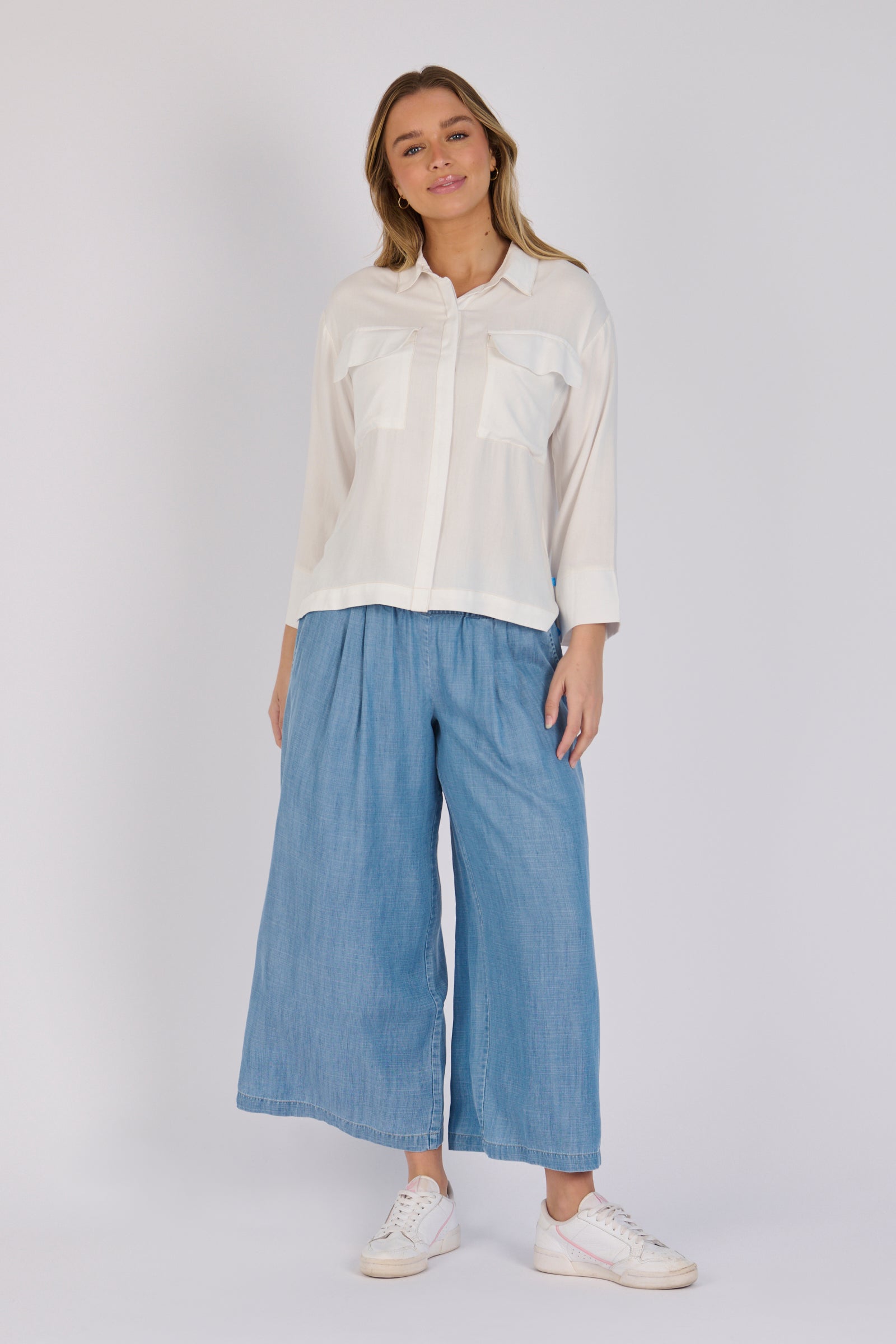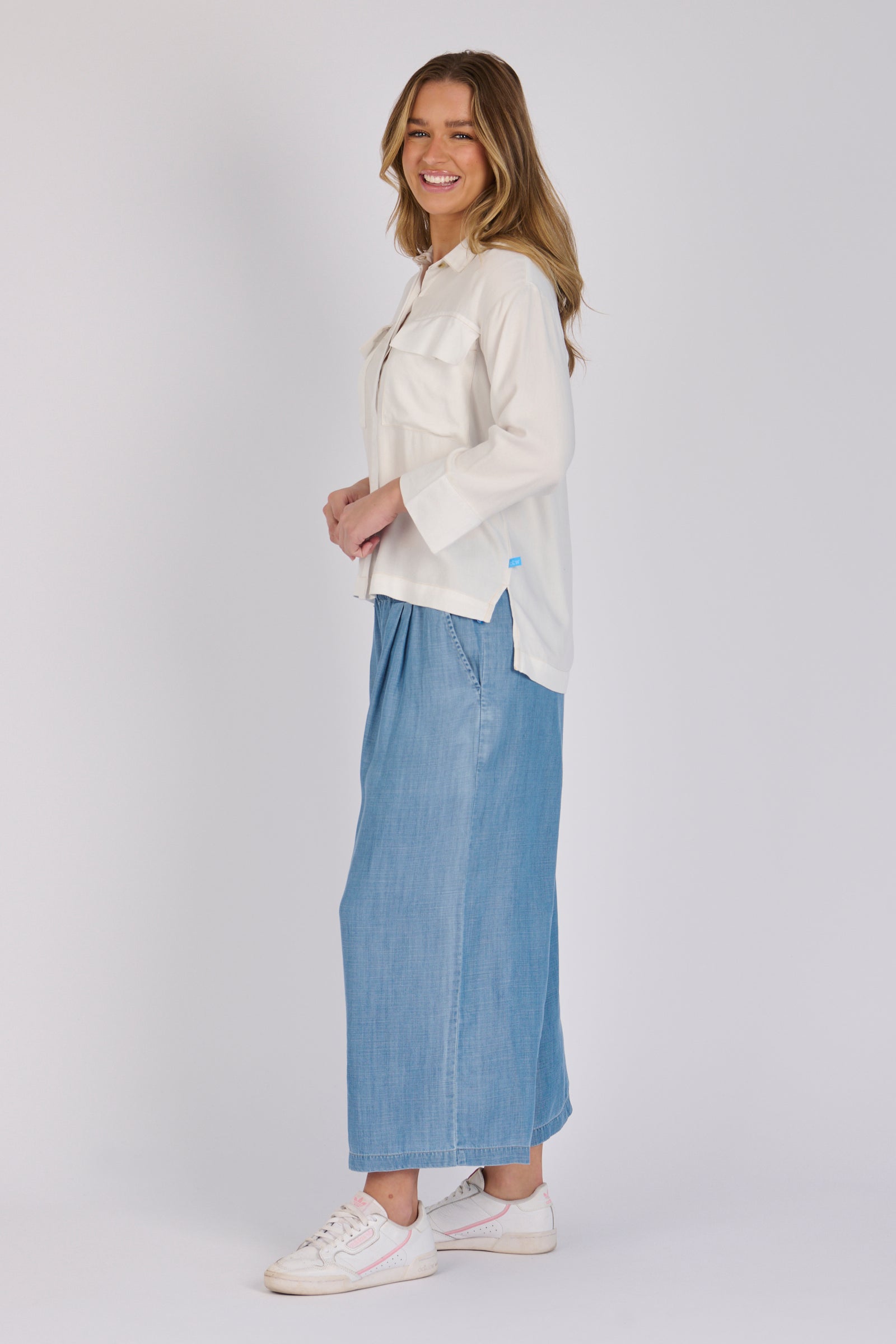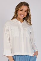 The Drop Back Shirt in White is crafted from beautifully soft 100% Lyocell, offering a light, breathable feel with a gently draped finish. Designed with a relaxed silhouette, statement front patch pockets and a subtle drop-back hem, this shirt brings an effortless, modern utility look to everyday outfitting. Pair it with denim or soft tailoring for easy, elevated style.