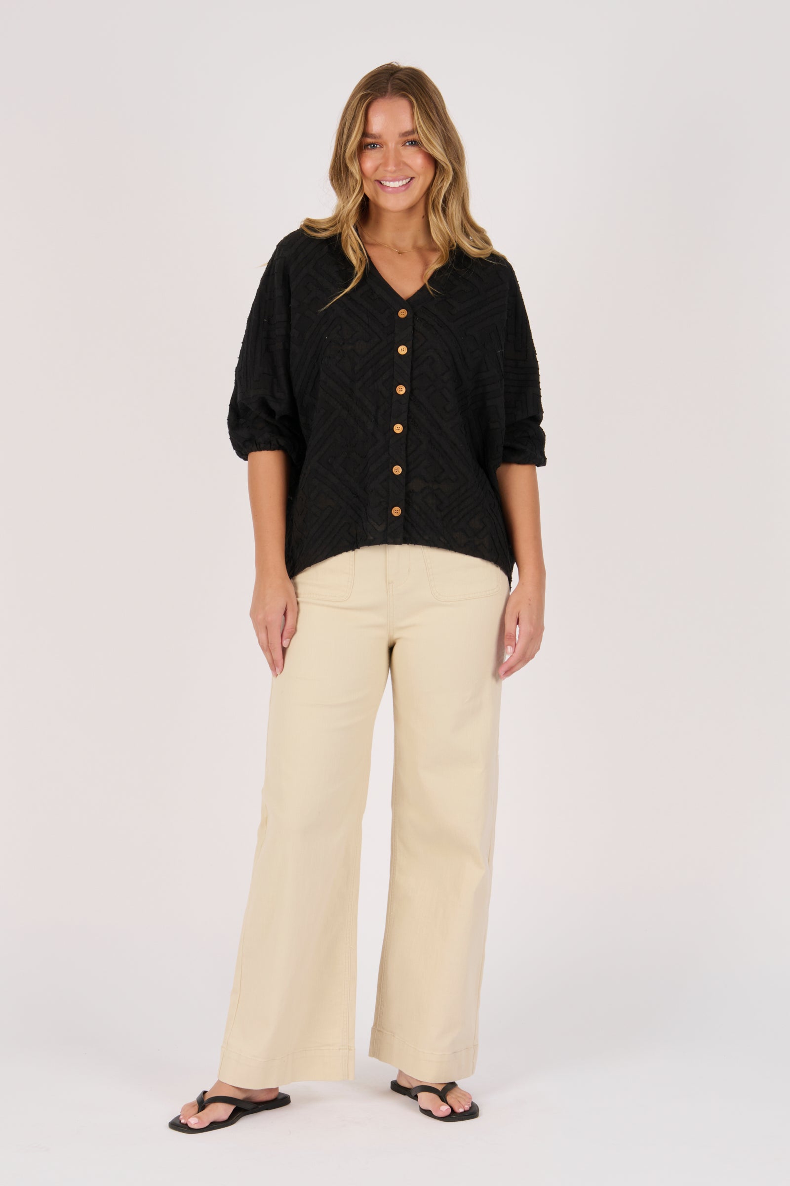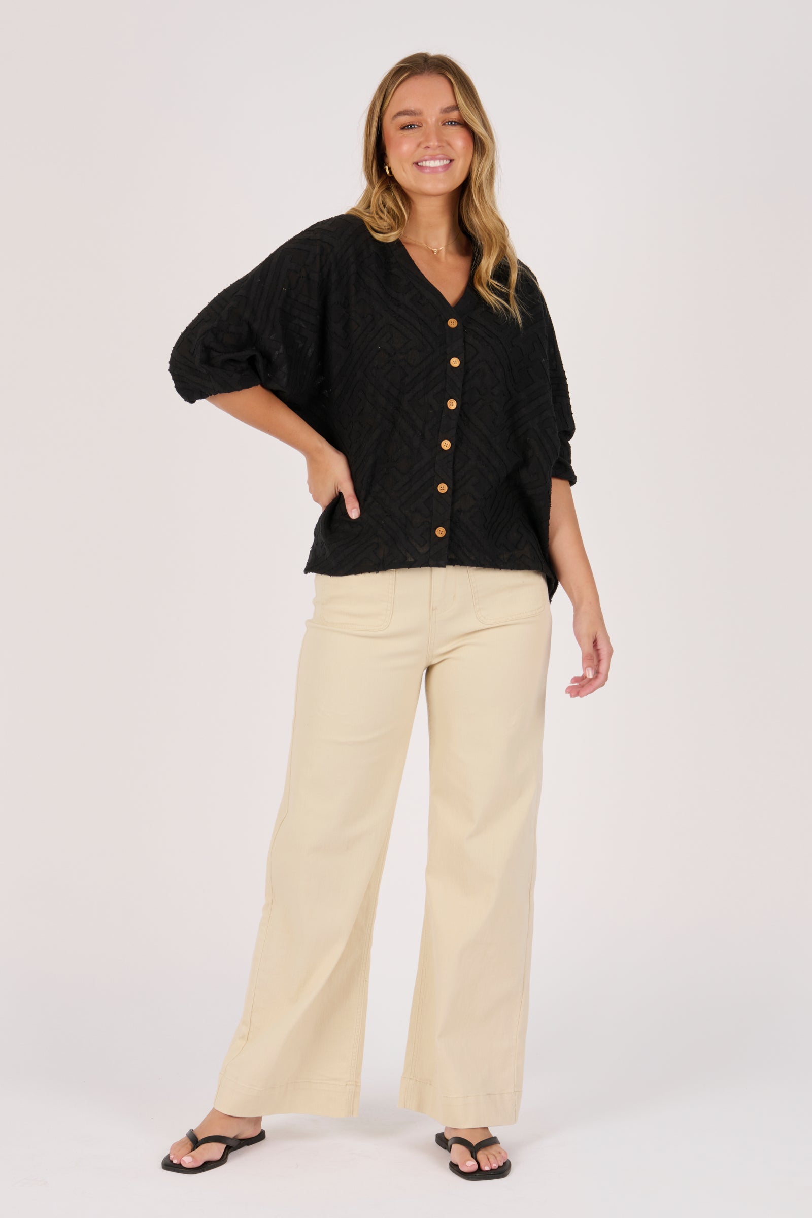 The Batwing Shirt in Black is crafted from breathable 100% Cotton for a soft, natural feel. Designed with a relaxed batwing silhouette, button-through front, and subtle textured weave, this shirt offers effortless style and all-day comfort. Perfect for pairing with denim or linen for an elevated casual look.